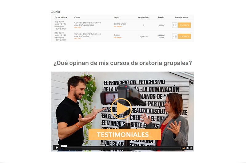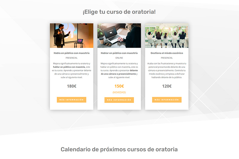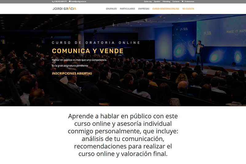 El cliente nos contrató para desarrollar su nueva página web con la intención de actualizarse y que su público, pueda adquirir los cursos de oratoria en pocos pasos y de manera precisa. Todo desde el móvil y de manera rápida.